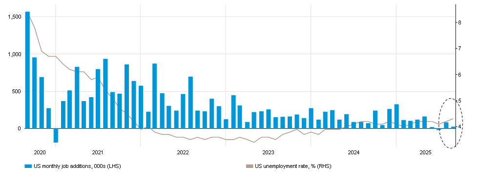 Chart 1: Stalling – US labour market sees slower job growth, rising unemployment:
