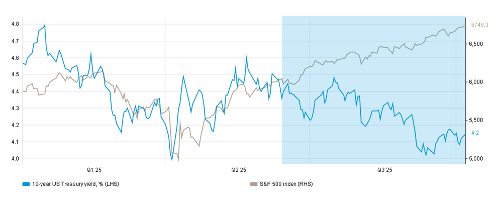 The US government officially shut down on 1 October, marking the start of the new US fiscal year without a funding bill as politicians on both sides argued over healthcare subsidies. The immediate impact was 900,000 Federal employees furloughed and 700,000 remaining on duty without pay. What does all this mean for markets? Despite expectations that all this should be interpreted as a hit to growth, the US stock market has remained stable since the shutdown and indeed continued its long ascent since the aftermath of Liberation Day in April. The key to understanding this lies in interest rates. Short-term interest rate expectations have softened to price in a Fed Funds rate of 3.6% in December (ie just under three cuts of 25 bps) while longer-bond yields have remained below 4.2%. In the absence of official jobs data (which had been due on Friday), the market placed a premium on the ADP private payrolls numbers, which were found seriously wanting. As implied short-term interest rates accordingly fell and longer-term bond yields remained anchored, stock investors focused more on this lowering of the discount rates by which securities are priced and less on the gloomy reassessment of the growth outlook for the US economy. The result was the apparent restoration of a counter-intuitive dynamic familiar to experienced investors in which bad news = good news. In fact this had been going on since June, with the shutdown simply highlighting the trend.